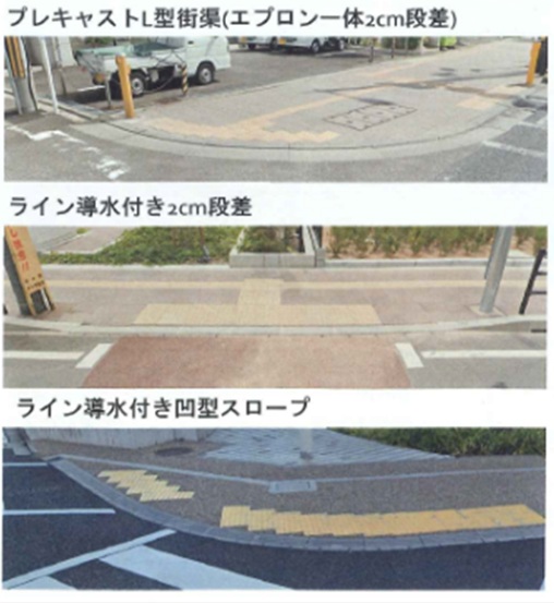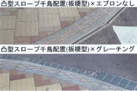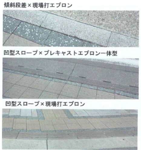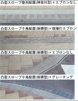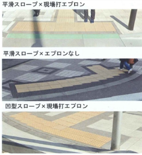 ・前輪が凸部に当たると若干抵抗感はるが問題なく走行できる(凸型スロープ整列配置(神奈川型)×エプロンなし 車いす利用者)・ライン導水の溝も気にならず走行は問題ない(凸型スロープ千鳥配置(板橋型)×現場打ちエプロン 車いす利用者)