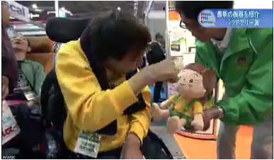 4月21日インデックス大阪で行われている「バリアフリー展」に作業所のみんなで行きました。介護ロボットのコーナーで、「頷きかぼちゃん」と遊んでいる様子がNHKのニュースで6秒間も放送されました。これで僕も有名人ですね!!