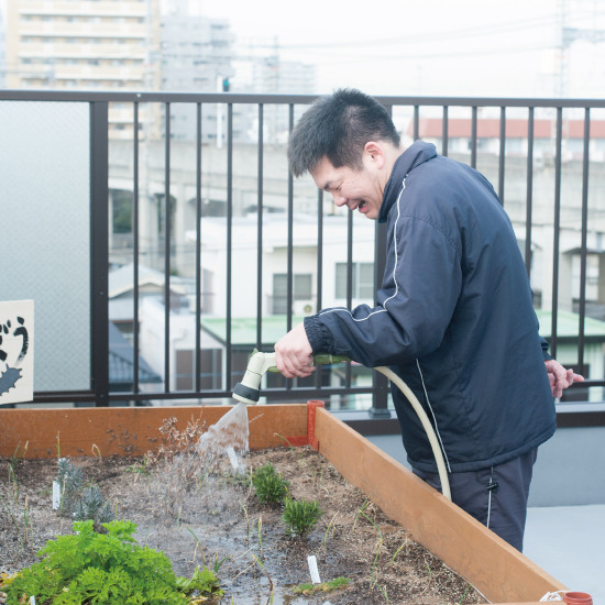 ちゅうぶの拠点である「おにわ」の屋上で育てている植物に水やりを行っている様子を撮影させていただきました。素敵な笑顔で水まきをしてもらっています。