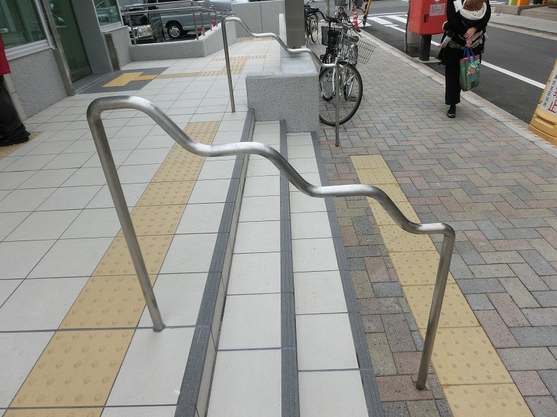 東住吉区役所正面に設置された波形手すりが、まっすぐな普通の手すりに付け変わりました。2月21日(日)肢体不自由、視覚障害者も入っての現場検証や話合いで、設置主体である大阪市(管轄は市民局)が付け替えを約束。今回、全面的に付け替えとなりました。