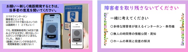 最後に、新たな機器開発の時には、障害者の意見を聞いてほしいということをお願いし、障害者を取り残した無人化の拡大をやめてほしい。インターホン、無人状況の情報公開、ホームの車両と段差の解消などに取り組んでほしいと訴えました。