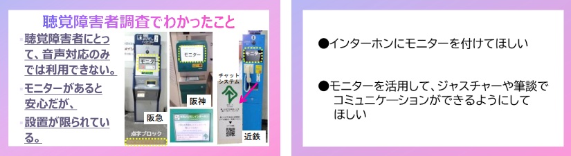 音声対応だけでは聴覚障害者は利用できません。モニターを設置して、筆談対応ができるようにしてほしいことを、とても良かった阪急電車の事例を紹介しながら理解を求めました。