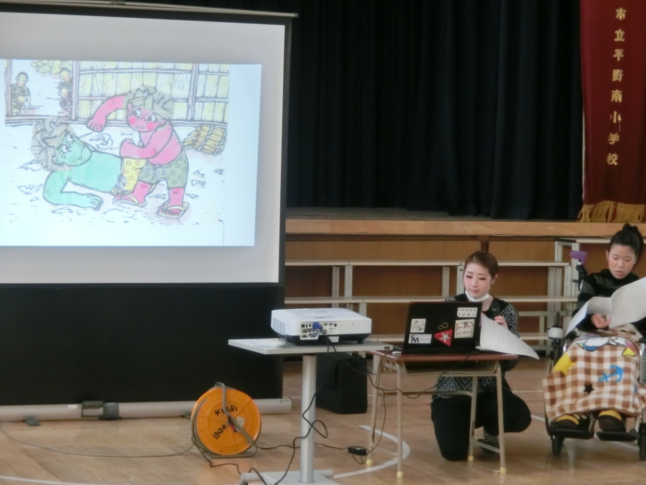 2/19(土)平野南小学校の1年生たちと赤おに青おにとの学校交流を行いました。