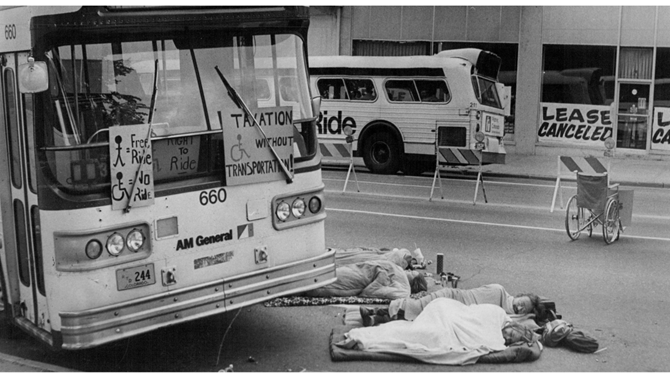 その始まりは、1978年です。19名の障害者が脱施設で地域に出てきたわけですが、車社会のアメリカではバスに乗れないとどこにも行けない。自分達にはバスに乗る権利があるんだと叫びながら、バスの下敷きになって寝ころぶ、車椅子をバスの前の真ん中に置いて動かないなどの闘いを展開し、ADA(アメリカ障害者法)ができる前に制度を整える最初の動きをしました。