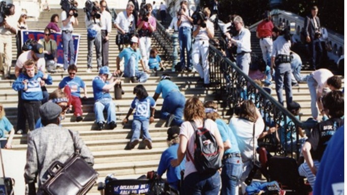 有名な9歳の女の子が階段を這いつくばって上がる様子、こんな小さな子がADAを通すんだと訴えた姿が大きな力になったのですが、この人たちはみんなアダプトの人たちです。