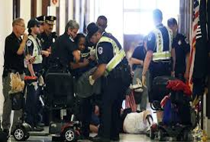 法律は通ったけど、詳細や予算はまだ決まってない部分があるので、少しでもダメージを軽減できるように交渉をしています。これは、シカゴアダプトの闘いです。議会に乗り込んで、カットは障害者の人生と自由に対する妨害だと訴えるわけです。逮捕されて追い出されそうになっている場面です。