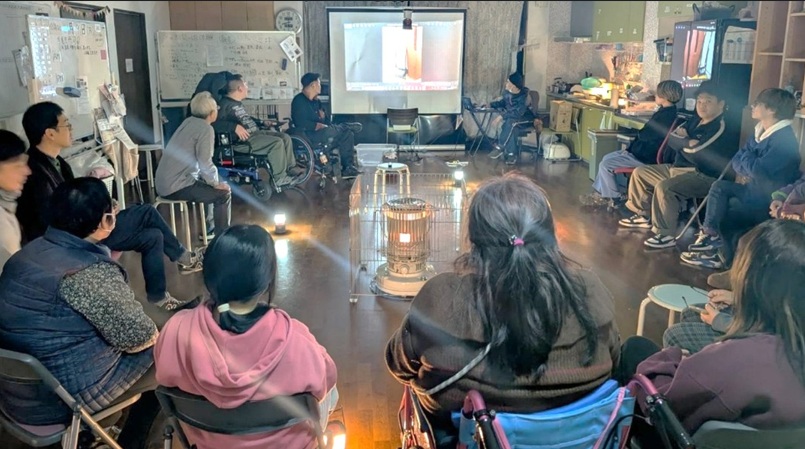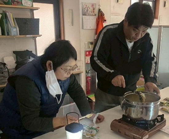 防災意識の向上を目指して、2月6日(金)16時から7日(土)の翌朝まで、おにわにてBCP冬の防災一泊を行いました。夏冬ごとに一泊を続けており、被災を想定して電気ガス水道が止まった設定で、防災食や防災備品を実際に使用、障害者、スタッフともに自宅以外で泊まる体験をする目的です。