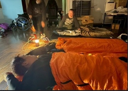 床に長尺シート(10m程)を敷いた上にイグサマット(数人分)を重ねて、寝袋で休みました。スマホ等はバッテリー(大)から充電。夜中はストーブを消すので、明け方はやや冷えます。概ね睡眠できたようですが、夜間のトイレ、靴下では床が滑って阿部さんは移動と移乗がすごく困難でした。ヘルパーさんも予想外。
